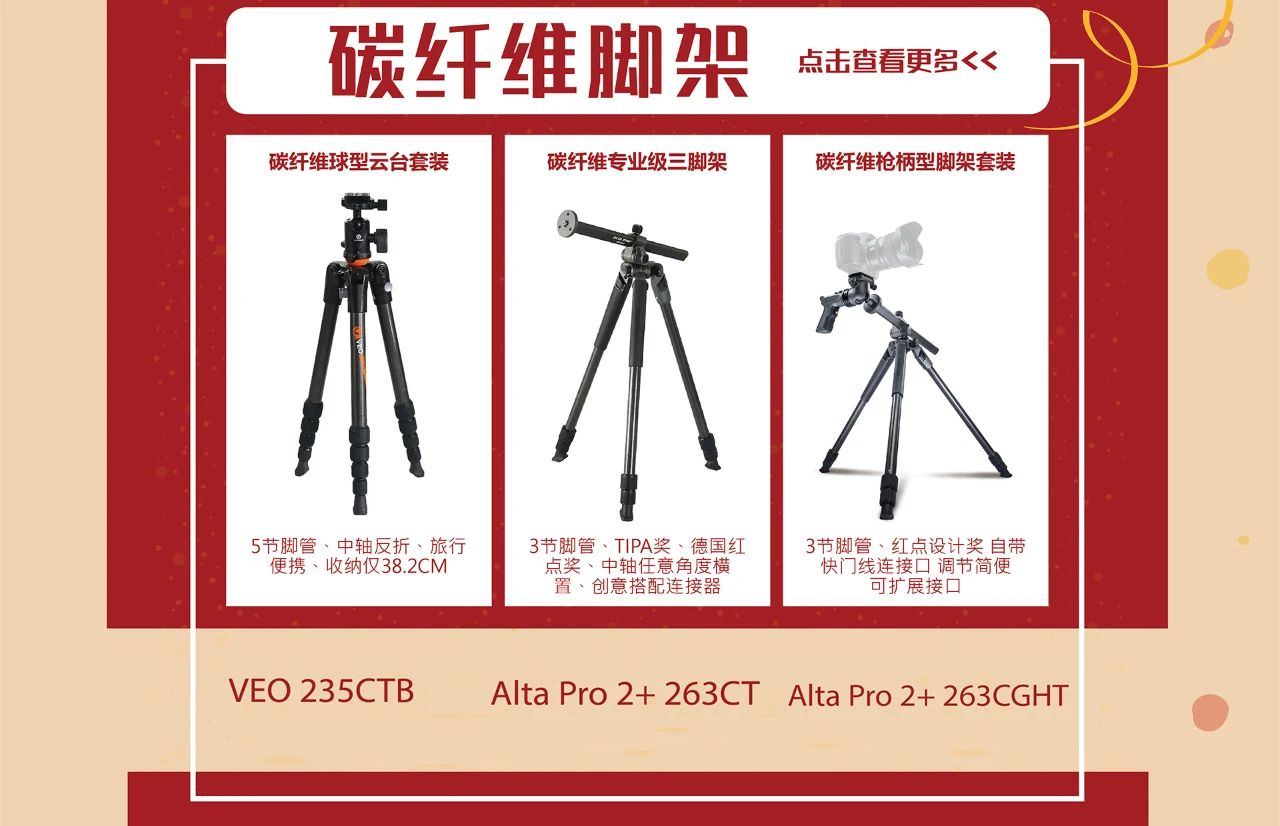 VEO 235CTB | Alta Pro 2+263CT | Alta Pro2+ 263CGHT 低中高三个等级碳纤维脚架分别为摄影爱好者、发烧友、专业人士量身定做。