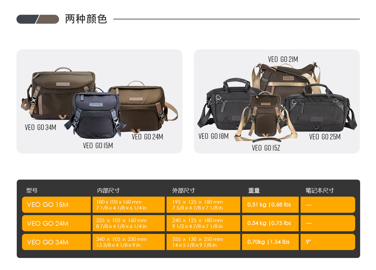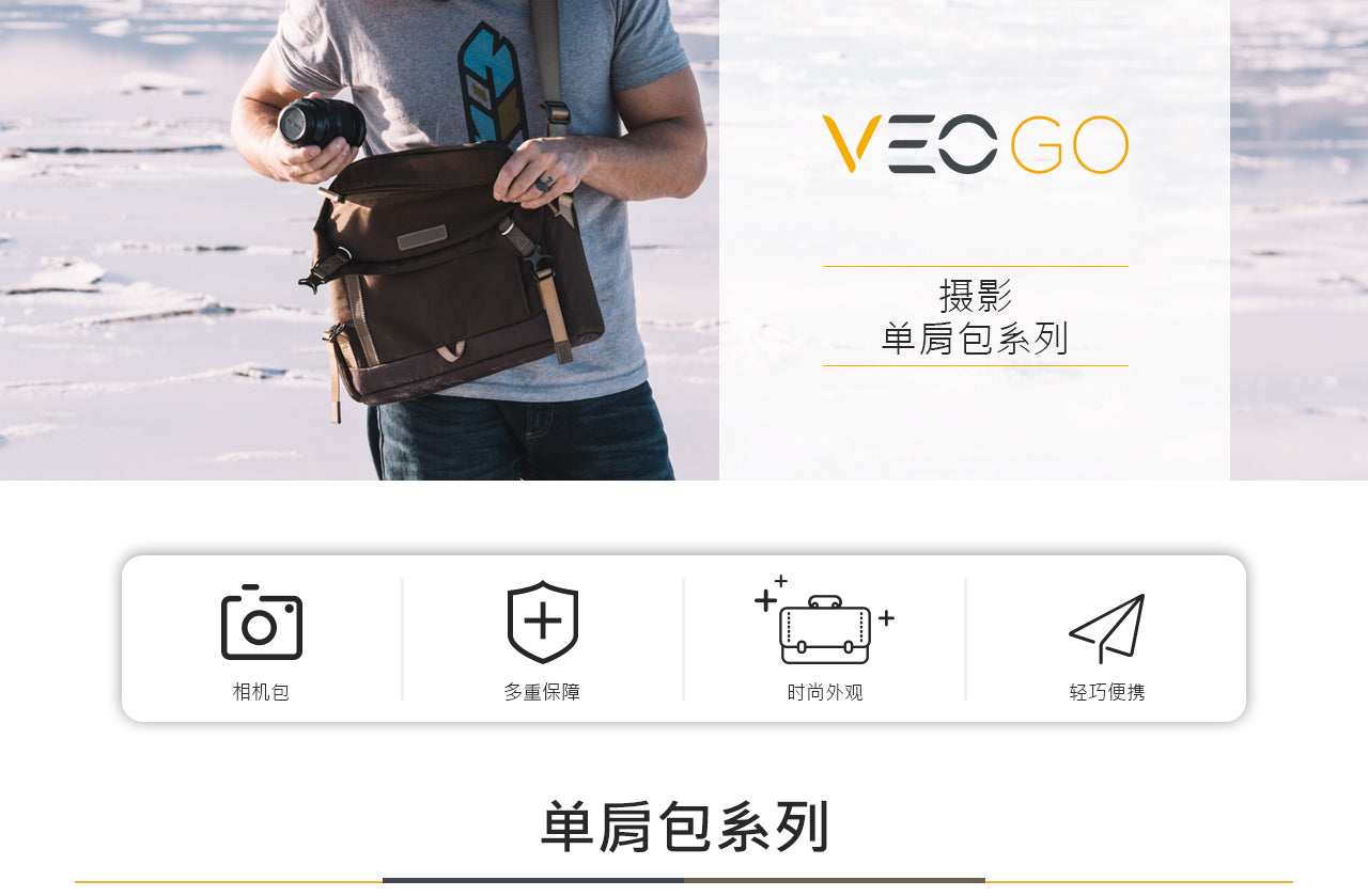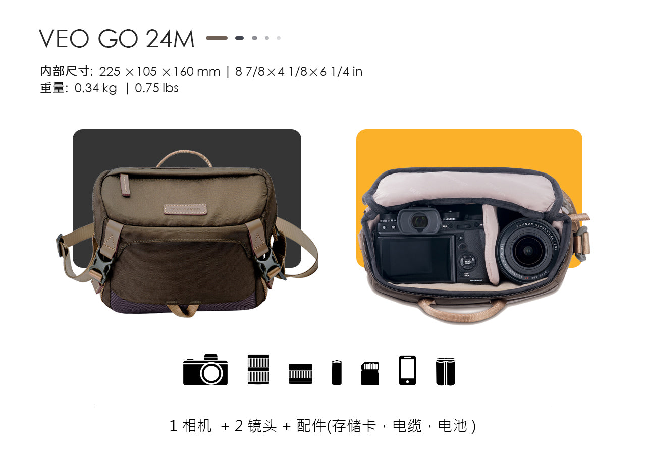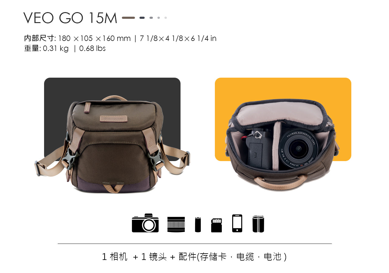 VEO GO是精嘉特别针对微单族群所规划,雅致的外观与时尚的流线设计,轻量的表面材质与厚实的保护型缓冲内布与隔板,实现了有份量的收纳,雅典时尚的外观兼具摄影与日常包用途,让人安心的保护性能。。