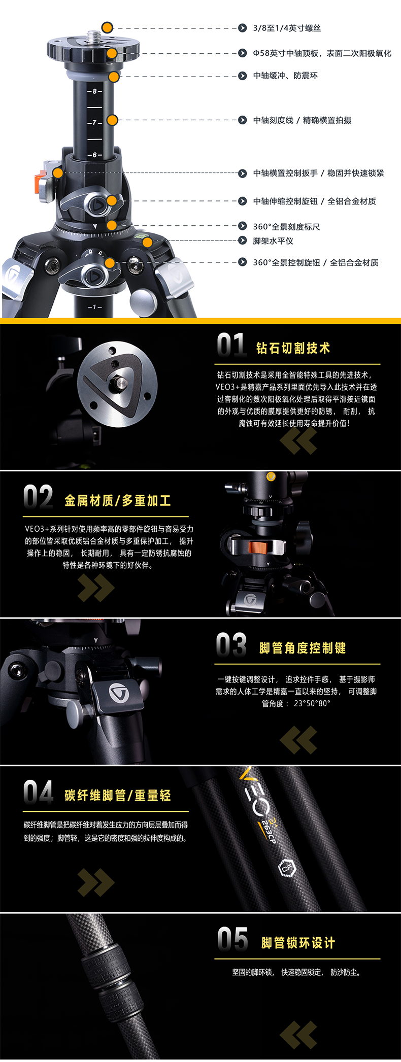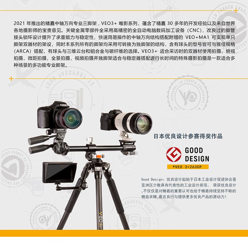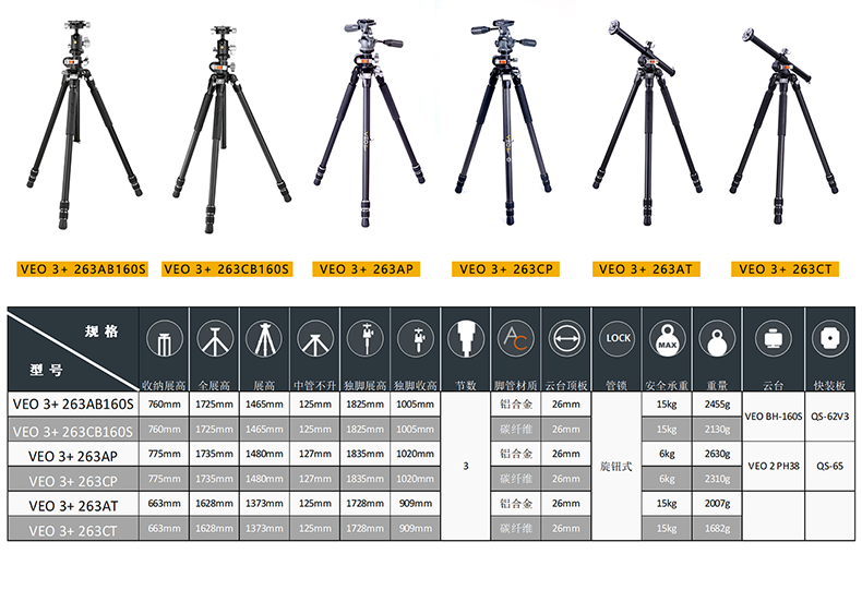 精嘉 VEO 3 三脚架系列 | 专业 单反 摄影 摄像 三脚架 | 中轴横置 万向 | 旅行尺寸 | 球形云台 | 三维云台 | 铝合金碳纤维 | 雅佳规格 | 含 快装板/卡扣 | 高承重 | 长焦镜头 | 索尼 佳能 尼康 微单 单反
