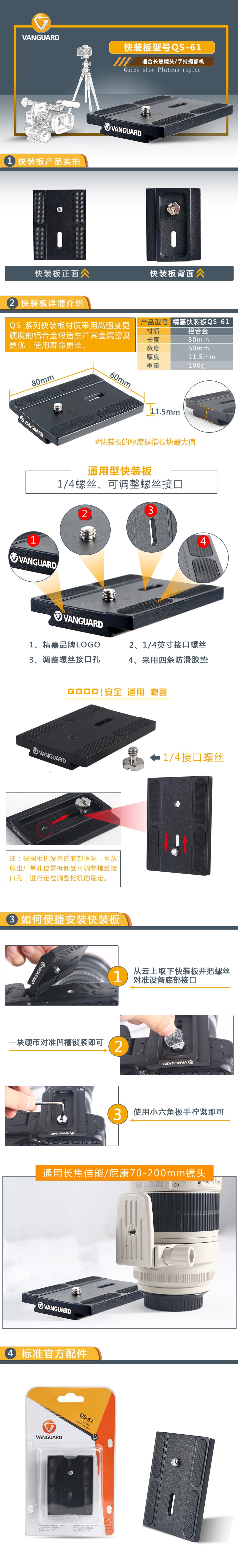 精嘉 QS-61 | 精嘉 云台 相机 快装板 卡扣 |雅佳规格 ARCA 型 |
