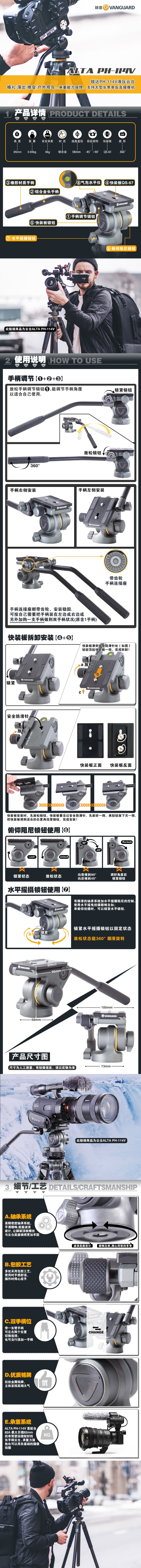 - 液压云台,操作流畅,并结合了Arca快装板,配上符合人体工程学的长手柄,可实现平稳的平移和倾斜